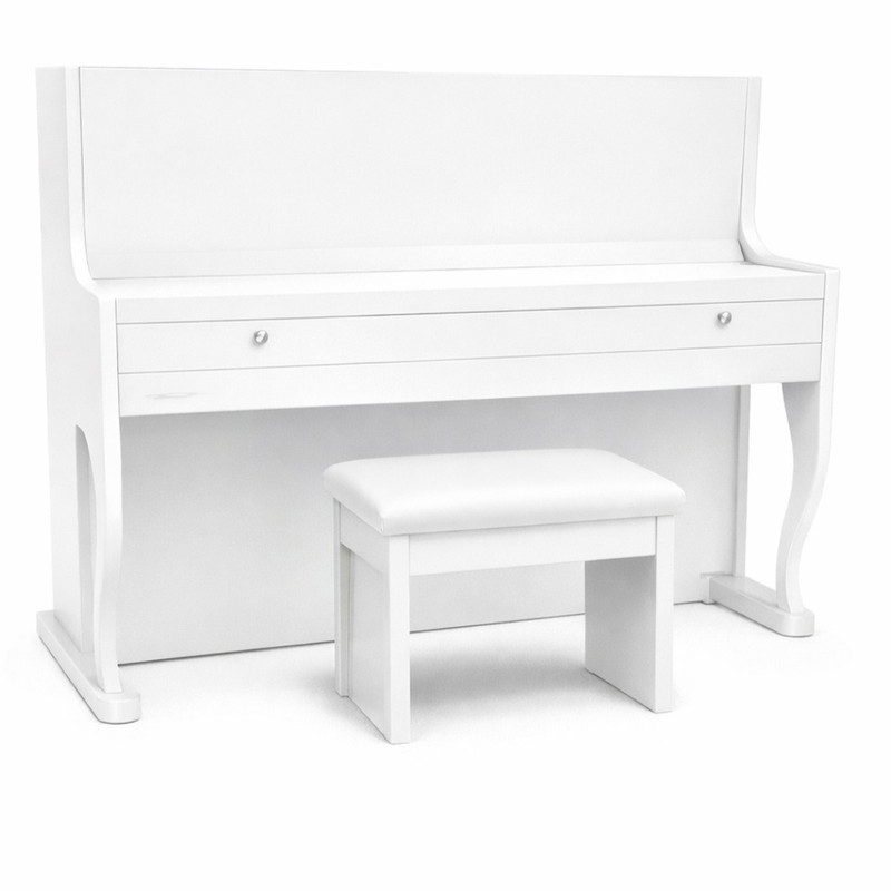 یراق آلات میز پیانو جانیار آکوستیک ساده طلایی از نوع مرغوب و بدون تغییر رنگ می باشند. صندلی این میز از جنس خود میز پیانو ساخته شده است.
